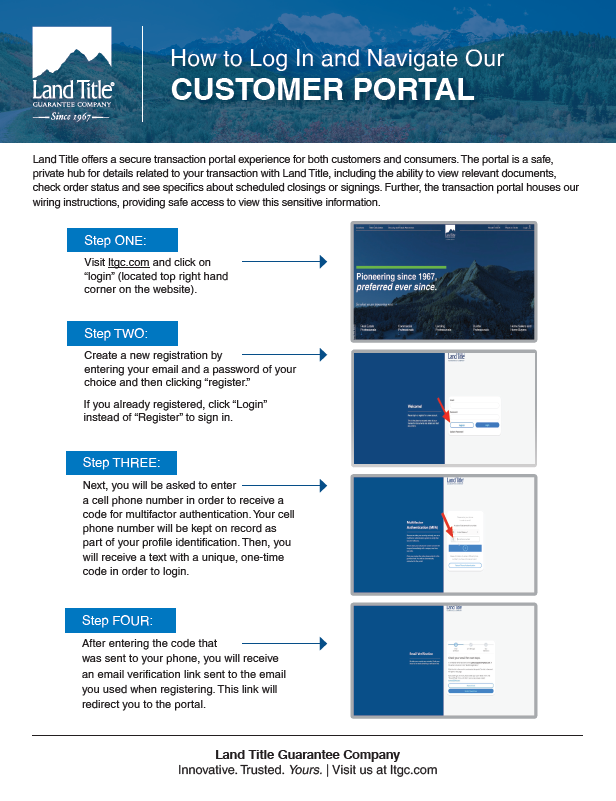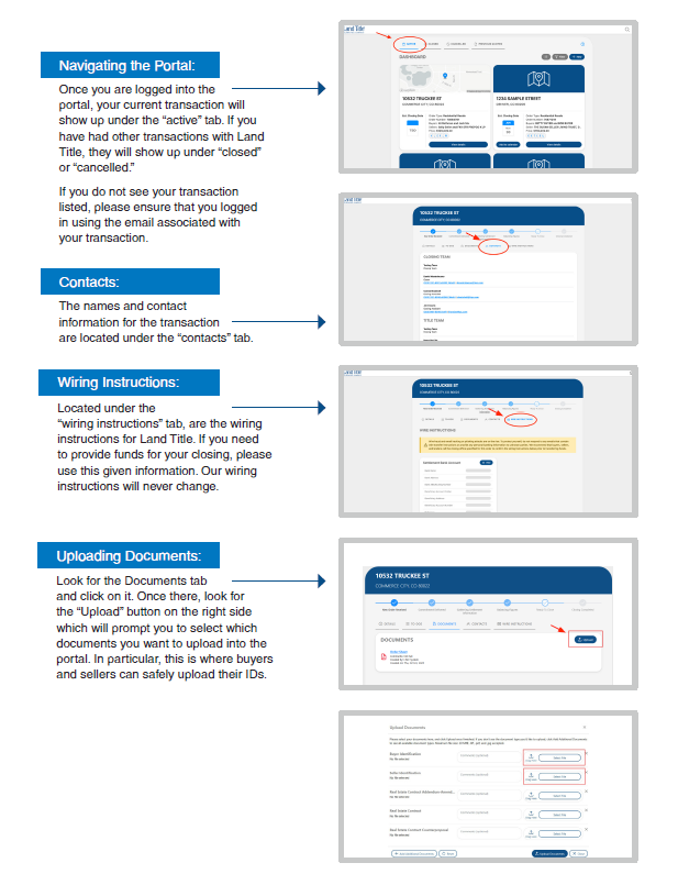 Land Title provides a safe, private portal for details and documents related to your transaction. In an era where cyber fraud is an unfortunate reality, we stay ahead of the curve by continuously refining our platform to provide a safe, state-of-the-art environment for you and your customers. As industry pioneers, we have evolved our portal to be more than a workspace, it is a one-stop location to view the details of the transaction, upload documents and fill out required reporting.
