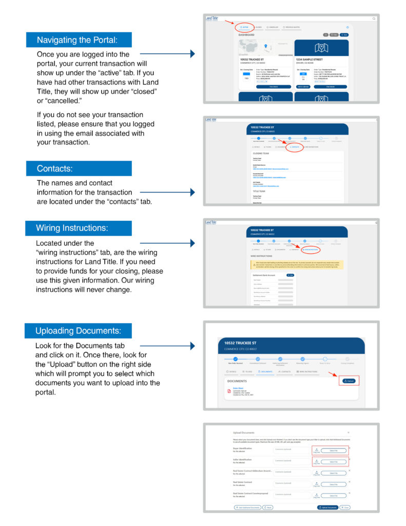 Land Title offers a secure portal experience for you and your customers, featuring real-time transaction tracking, document access and contact information for our closing teams. Additionally, we host our wiring instructions within this encrypted environment to help provide an extra layer of protection against fraud.